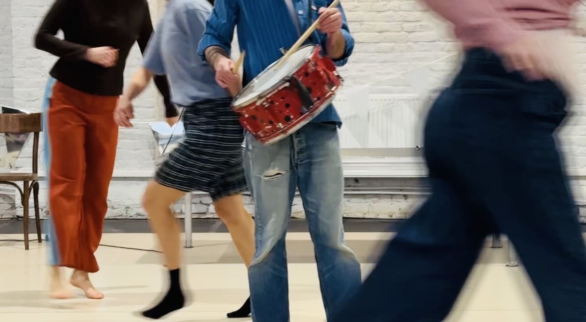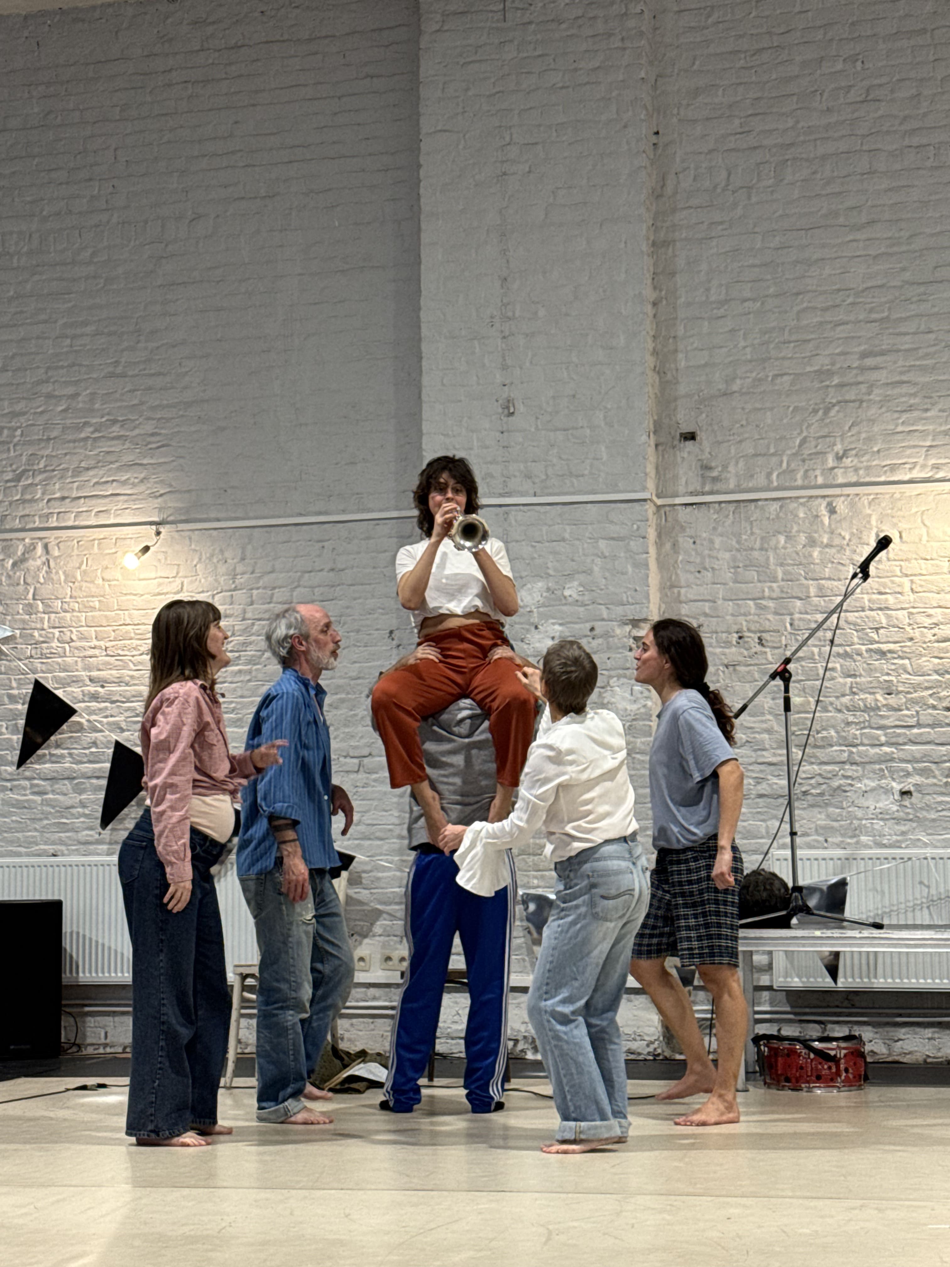 In een feestelijke sfeer zorgen dans en koperblazers voor vreugde, energie en saamhorigheid. De artiesten komen samen om een parade voor te bereiden en nodigen het publiek uit om deze laatste repetitie mee te beleven. Ze komen in beweging, stemmen zich op elkaar af, observeren elkaar, helpen elkaar. De gebaren zijn eenvoudig, soms fragiel, altijd oprecht. Hier gebeurt beweging nooit alleen: ze wordt met en naar de ander toe opgebouwd, in luisteren en aanpassen.